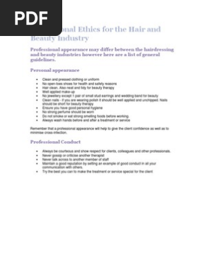 The Guild of Professional Beauty Therapists Code of Ethics The Code of Ethics is provided to advise members of The Guild of Professional Beauty Therapists of what is acceptable practice. Ad Get Your Code of Conduct Template Download Print in Minutes. Always wash hands before and after a treatment or service Remember that a professional appearance will help to give the client confidence as well as to minimise cross-infection.
